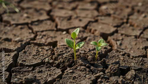 Green plant growing in soil. Drought. Background with cracked earth and sprout green plant, isometry, with white tones