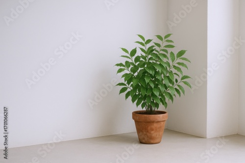Green Plant in Clay Pot Enhancing Minimalist Interior Design with Natural Light and Clean Aesthetics