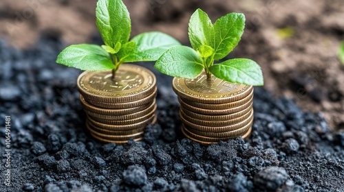Green plants emerging from stacks of coins, symbolizing growth, investment, and the connection between nature and finance.