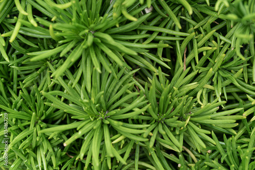 Green plants in the botanical garden. Succulents and cacti with thorns and decorative grass.