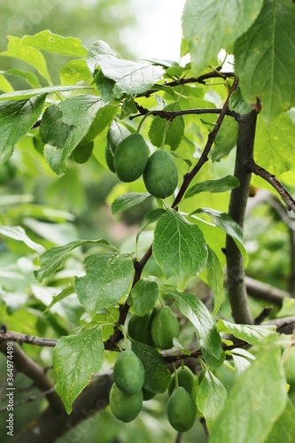 Green plums on a tree in the summer garden