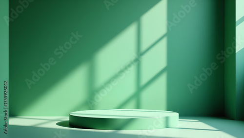 Green Podium Backdrop for Product Display in Interior Room: Sunlight and Shadows on Green Concrete Wall - Perfect Photo Stock Concept with Empty Space for Creative Use