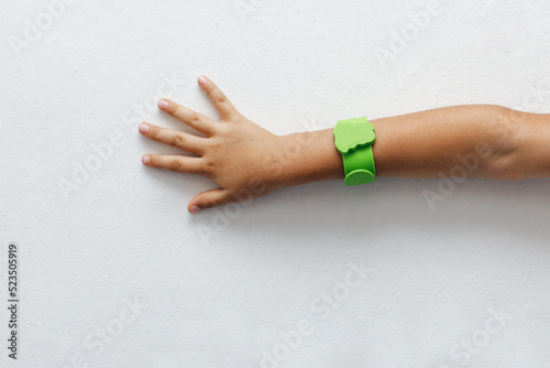 Green protective bracelet against insect mosquitoes on the girl's hand close-up