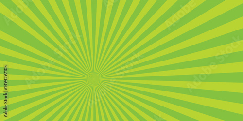 Green ray background. Vintage abstract texture. Retro starburst, sun beam. Halftone color. Light burst. Bright shine sunburst. Empty blank, scrapbook surface. Clean nature energy.