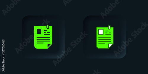 Green Resume icon isolated on black background. CV application. Searching professional staff. Analyzing personnel resume. Black square button. Vector