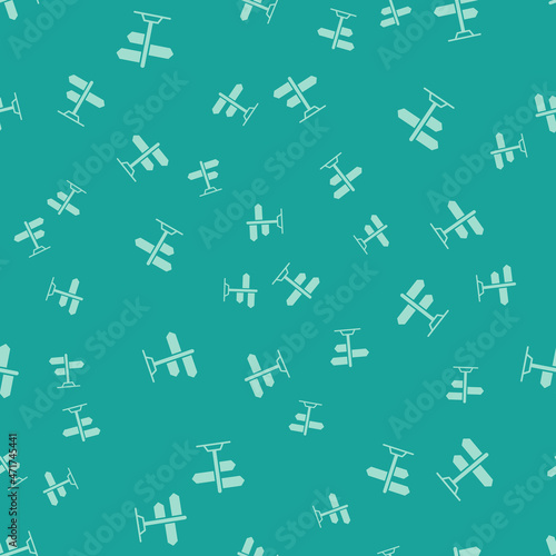Green Road traffic sign. Signpost icon isolated seamless pattern on green background. Pointer symbol. Street information sign. Direction sign. Vector