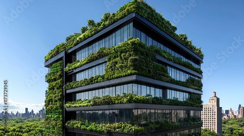 Green Rooftops and Vertical Gardens in Modern Architecture, a realistic photo of a sleek urban building covered in lush green rooftop gardens and cascading vertical greenery, with a clear blue sky.
