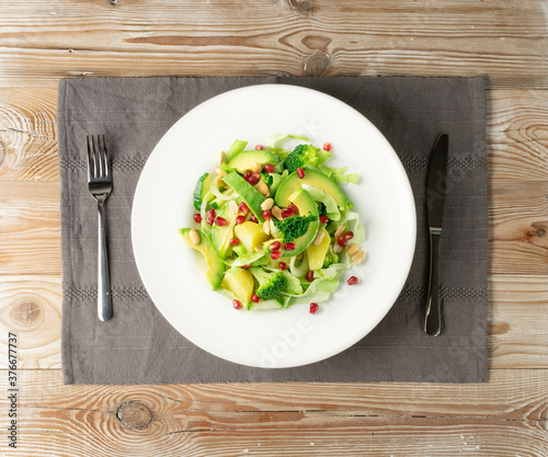Green Salad with Avocado, Cucumber and Nuts on White Plate