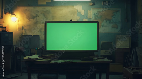 Green Screen Monitor On Desk In Vintage Office With Maps