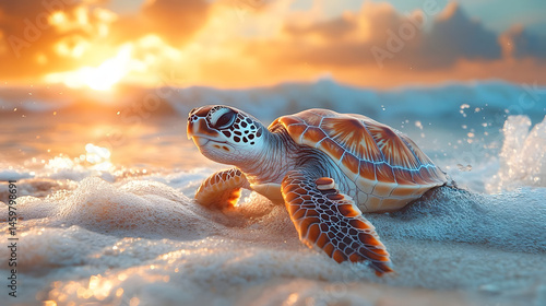 Green sea turtle in its natural wildlife habitat on the beach and in the sea