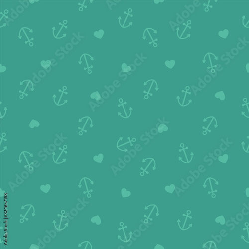 Green seamless pattern with anchors and hearts