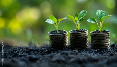 Green seedlings growing in soil on stacks of coins symbolizing financial growth, sustainability, and eco-friendly investment practices for a better future