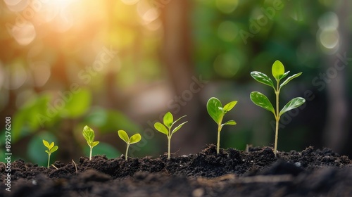 Green Shoots Growing in Sunlight - Growth, Nature, Sustainability Concept - Five green seedlings growing in rich soil, bathed in sunlight. The image symbolizes growth, new beginnings, progress, and th
