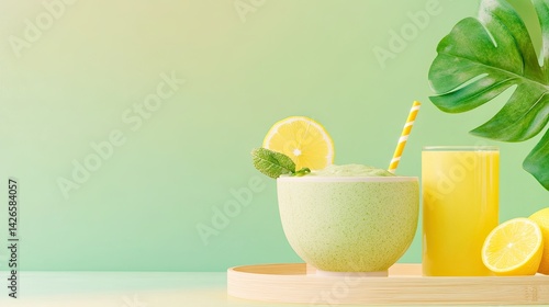 Green Smoothie Bowl And Summer Vibes Refreshing Lemonade and Mint Smoothie on a Bright Summer Background tropical smoothie content.