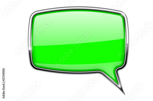 Green speech bubble. Square 3d icon with chrome frame