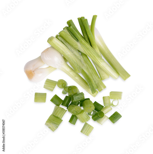 Green spring onions and sliced isolated on white background. Top view