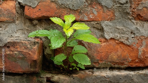 Green sprout in aged brick wall.