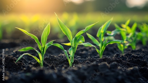 Green sprouts in the soil against a sunset background. Useful for environmental projects, gardening magazines and advertising of organic products.