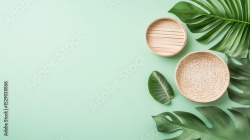 Green surface with woven bowls and leaves. Decorative items for zero waste living concept with copy space, flat lay arrangement.