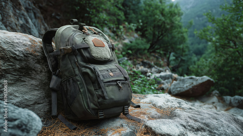 Green Tactical Hiking Backpack on Forest Rock