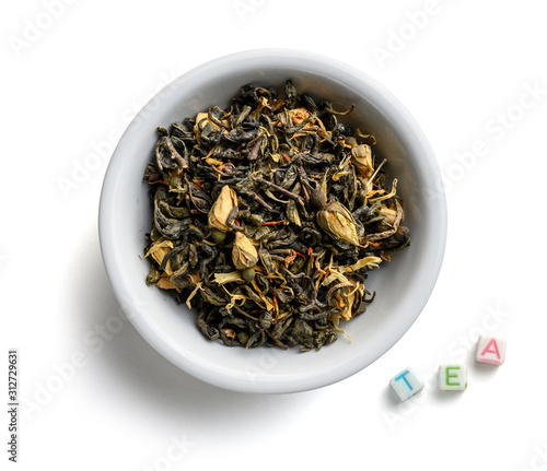 Green tea with natural aromatic additives. Top view on white background