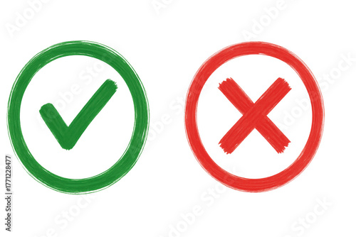 Green tick mark in a circle and red x mark in a circle as brush strokes, indicating correct or incorrect choice