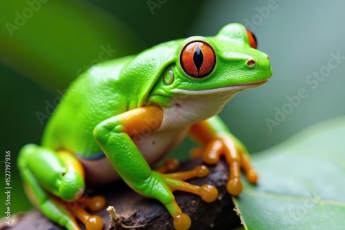 Green tree frog perched on white, vibrant skin, design element, vibrant