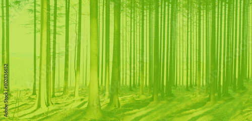 green tree trunks in background, summertime season, environmentally friendly plants, blurred photo of mysterious foggy landscape with trees in forest, mysterious mystical concept