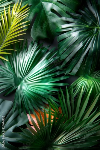 Green tropical palm leaves against a dark background, casting shadows and creating a vibrant, lush appearance. Poster and banner