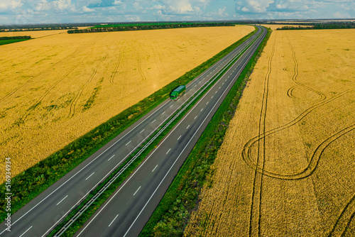 green truck driving on asphalt road along the yellow wheat fields with a cloudy sky. seen from the air. Aerial view landscape. drone photography. cargo delivery