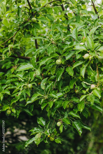 Green unripe small apples hang on a tree branch with leaves in the garden. Photography of nature, food.
