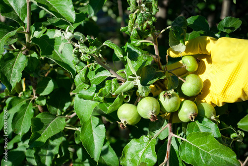 Green unripe small fruits apples on a tree, in the hands dressed in yellow rubber gloves, on the background of green grass lawn harvesting on a sunny day spring vacation beauty