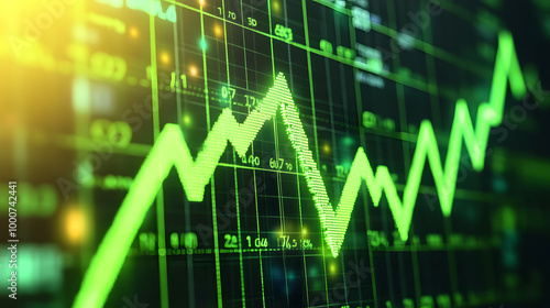 Green upward trend line on a financial chart with data and numbers on the screen.