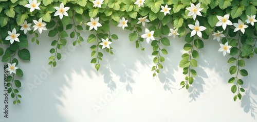 Green vine plant with white flowers hangs down a plain wall. Sunlight creates soft leaf shadows on the background. Fresh natural border, organic decor element, spring season.