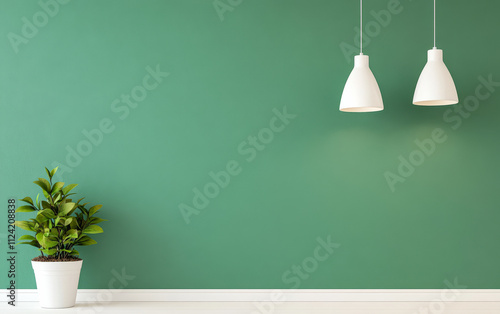 Green wall with hanging lights and a potted plant in a minimalist interior space