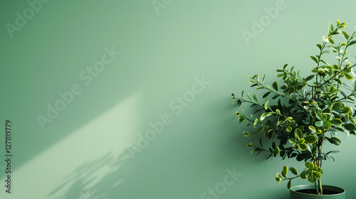 Green wall with potted plant casting shadows, creating a serene indoor atmosphere