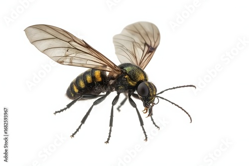 Green wasp studio shot, wings spread, isolated, white background, insect illustration