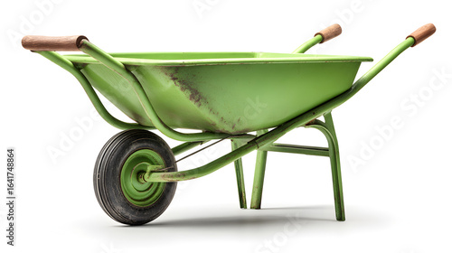 Green wheelbarrow garden tool rustic metal aged handles wheel transport gardening landscaping