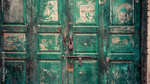 Green worn out wooden door with lock on
