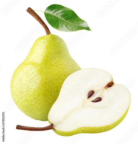 Green yellow pear fruit with pear half and green leaves isolated on transparent background. Full depth of field.