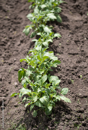 Green young potato plants (Solanum tuberosum) in row growing in garden on brown soil. Close up. Organic farming, healthy food, BIO viands, back to nature concept.