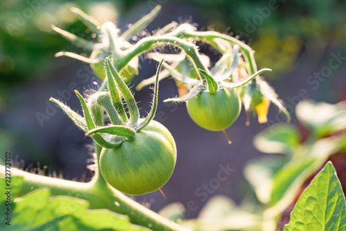 green young tomatoes on the branches in the greenhouse