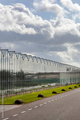 Greenhouse exterior under a sky with nice clouds in Westland in the Netherlands