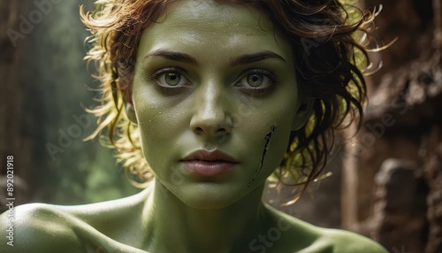 Green-Skinned Woman with Intriguing Expression.