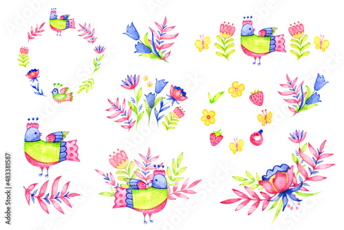 Greeting card, invitation, banner. Frame for your text with floral background. Folk painting illustration.