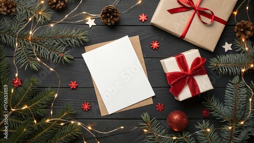 Greeting Card Mockup with Gifts and Fir Branches on Wooden Background - 7