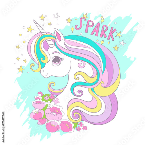 Greeting card with cute unicorn with flowers and lettering vector