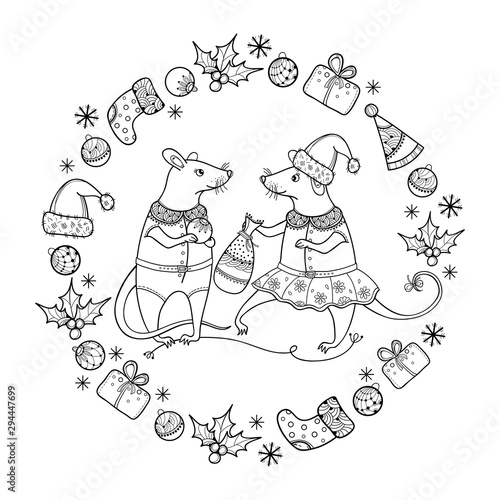 Greeting card with outline happy rats with Christmas bag in black isolated.