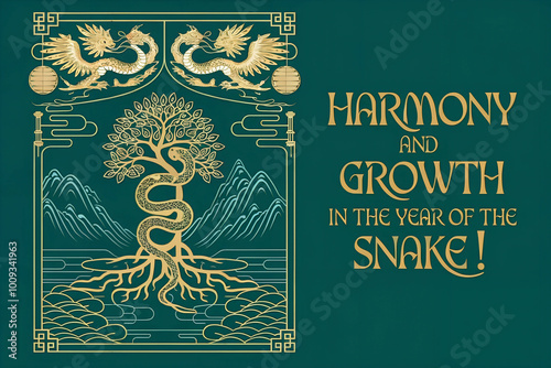 Greeting card, Year of the Snake Harmony and Growth with Elegant Gold Design on Green