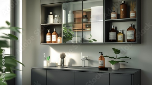 Grey bathroom countertop with sink, soap, toothbrush, mirror, toiletries, plant. Tranquil bathroom scene with light grey walls, minimalist design, sleek finish.